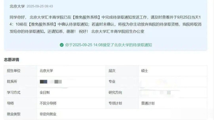 2025年9月25日,北京大学汇丰商学院的研究生拟录取通知,为这场长达十年的“自证”画上了一个旁人看来无比辉煌的句号。